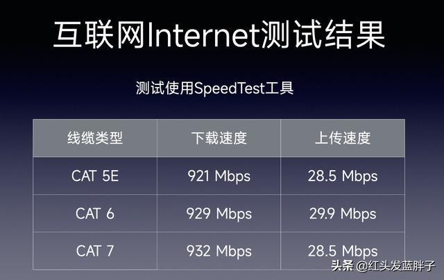下载速率上不同类型线缆的实际速度差在2%左右,上传速率上不同类型线缆的实际速度差在5%左右