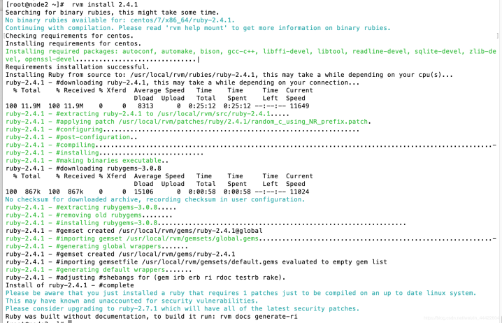(7)安装Ruby2.4.1版本(这个命令耗时较长,我花了25分钟才下载完毕,建议后台挂着下载即可),过程中下载失败,重新执行命令下载即可