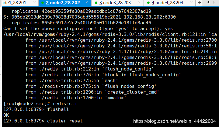 执行创建redis集群的命令(根据自己端口情况设置):./redis-trib.rb create --replicas 1 192.168.28.201:6379 192.168.28.202:6379 192.168.28.203:6379 192.168.28.204:6379 192.168.28.201:6380 192.168.28.202:6380