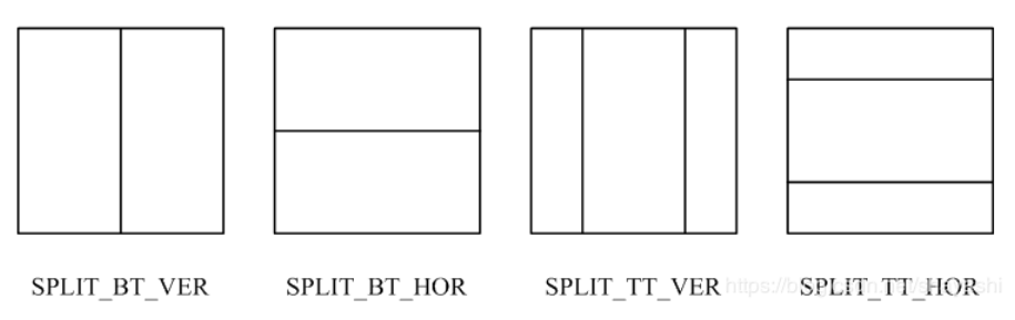 然后,在QT的叶节点可以通过二叉树或三叉树结构进一步划分。二叉树和三叉树划分可以交错并递归进行。但是,一旦应用二叉树或三叉树划分,就不允许进行四叉树的划分了。二叉树和三叉树有水平和垂直两种划分类型。对于二叉树划分,两种划分类型都是对称的。对于三叉树划分,划分的比例为1:2:1。